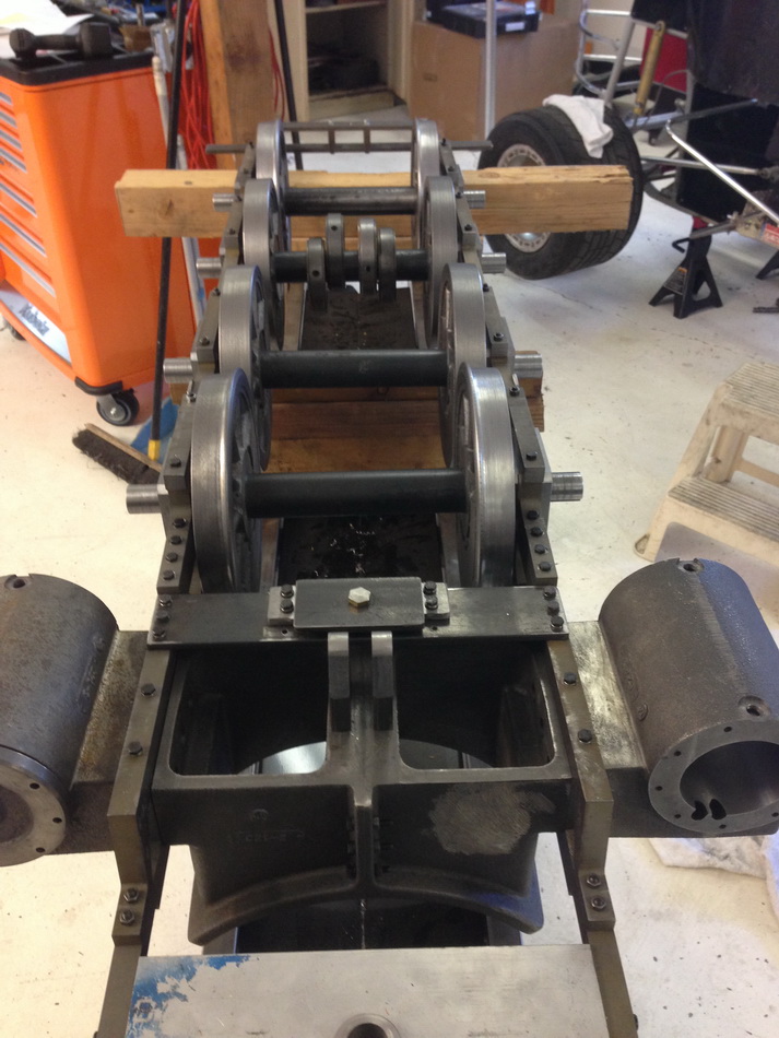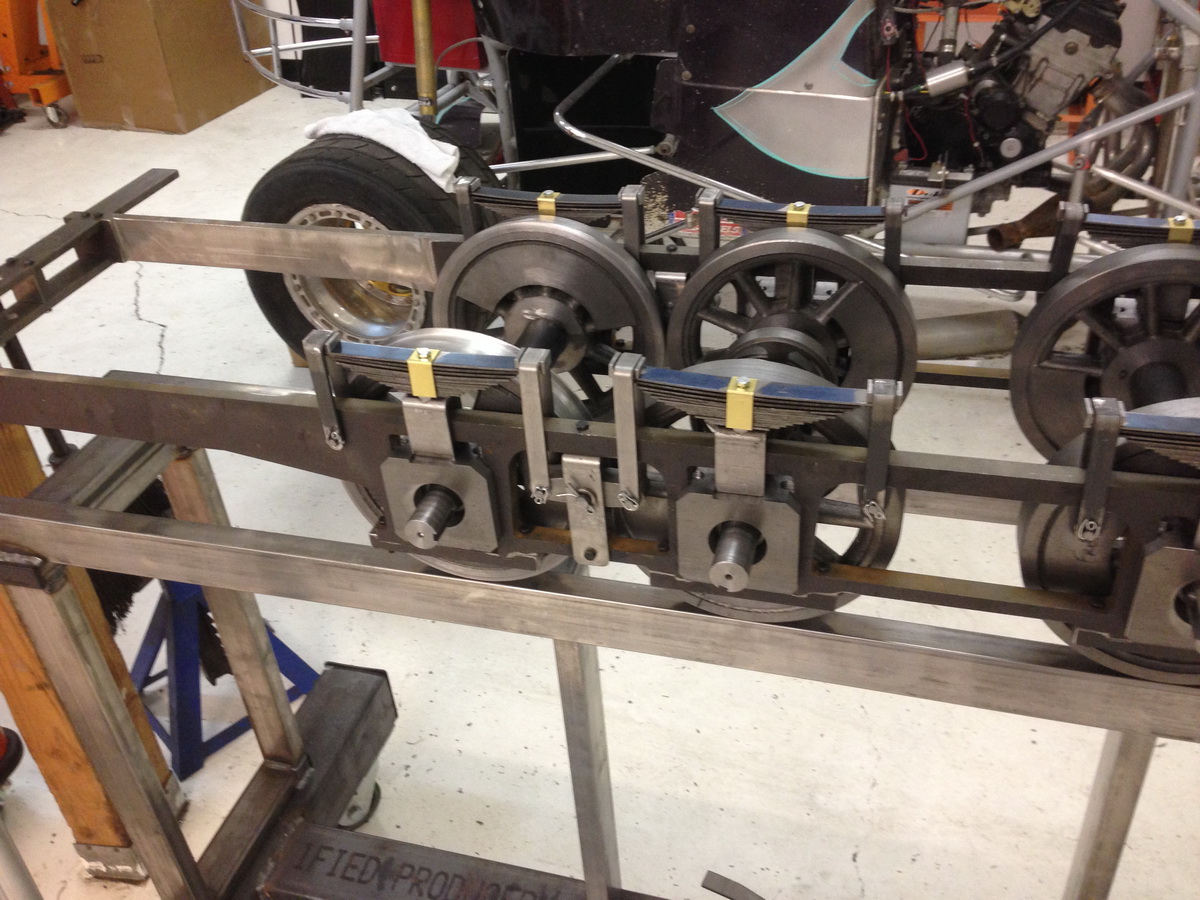 got the two center axles in the frame its a tight fit but there in there and then i found that the driver hits the spring rigging center pin a small amount of time on the lathe and i fixed that. should have this chassis rolling in the next couple weeks then we will need a coupler to drag it around and see how much bind we have.